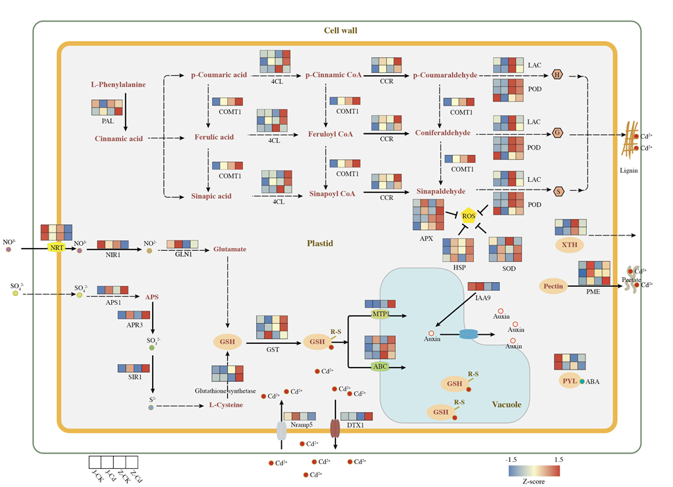 (注:表达热图从左至右依次为J-CK、J-Cd、Z-CK、Z-Cd。每个差异表达基因的表达水平是三个生物样本的平均值,然后进行z-score标准化。)
