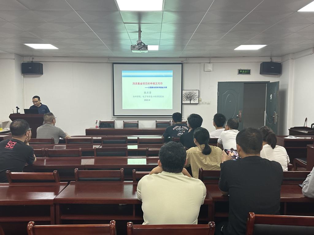 2023年9月28日下午,台州学院电子与信息工程学院院长张石清教授应邀来到我院开展《国家基金申报与写作》主题讲座,为我院科研工作者国家基金申请书撰写及项目申报传授实战经验。讲座由副院长王小虎主持,学院青年博士、教师代表参与此次讲座。