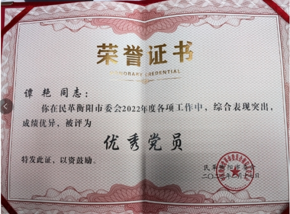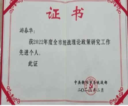 近日,民革湖工支部多名党员获省市级表彰,其中游春华获“市优秀政协委员”和“市统战理论政策研究工作先进个人”称号,彭艳获民革湖南省委“优秀党员”称号,谭艳获民革衡阳市委“优秀党员”称号。