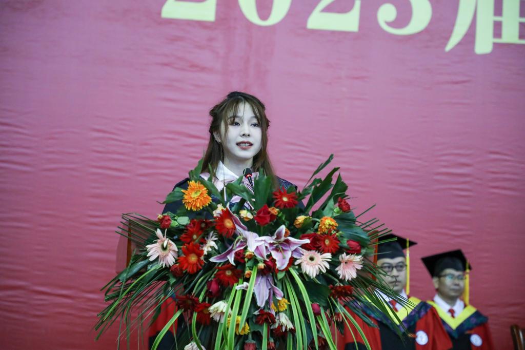 优秀毕业生代表、商学院杜菁菁,优秀校友代表、材料科学与工程学院2018届校友蔡铮莹,教师代表、智能制造与机械工程学院曹羽鑫分别在典礼上发言。