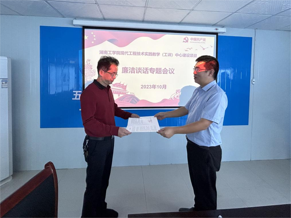 10月10日上午,现代工程技术实践教学(工训)中心建设项目廉政谈话专题会议在项目部会议室举行,项目施工方及学校相关职能部门负责人共同接受了一次集体的廉洁教育。校党委委员、副校长黄红卫,校党委委员、纪委副书记袁勤出席会议。