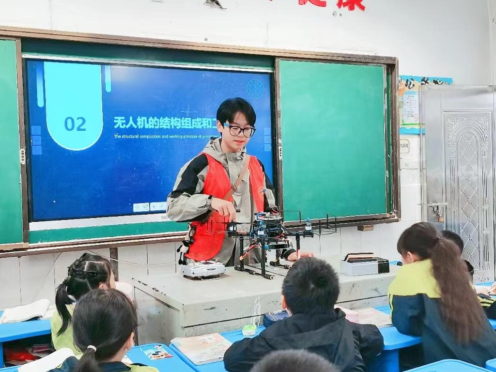 科普基地的学生志愿者们从无人机的国内外发展、无人机的结构组成和工作原理以及无人机在实现“双碳”战略上的应用三个方面给小学生们上了一堂有趣而又意义十足的科普课。他们介绍了国内无人机的领头企业,无人机在我国虽然起步较晚,但呈现快速增长态势,目前我国无人机行业的发展特别是民用无人机的发展走在了世界前列。通过现场无人机实物展示及电子竞赛题目中无人机设计测试视频讲解,让小学生们了解了无人机的机械结构、通过控制程序实现无人机机身稳定控制、行为控制、安全保护、外部感知避障等功能。科普基地的学生志愿者们还介绍了无人机技术如何助力实现“双碳”目标。通过无人机进行农作物的巡查和监测,帮助农民调整施肥、灌溉和农药使用,减少农药和肥料的过度使用,提高农业生产的效率和可持续性;无人机用于城市交通监测和管理,优化交通流量和减少交通拥堵,减少车辆排放和燃料消耗;无人机搭载各种传感器和仪器,监测大气污染、水质状况、海洋生态系统等,提供实时数据支持环境保护。整个讲解过程,小学生们听得津津有味,不断地向讲解志愿者提出一个又一个问题,对无人机技术表现出浓厚的兴趣和探索学习相关知识的强烈欲望。