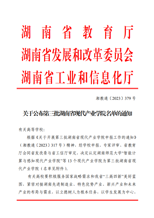 近日,湖南省教育厅、湖南省发展和改革委员会、湖南省工业和信息化厅联合发布《关于公布第三批湖南省现代产业学院名单的通知》(湘教通〔2023〕379号),英国上市公司官网365智慧安全现代产业学院获批立项,成为英国上市公司官网365首个湖南省现代产业学院。