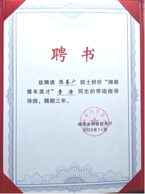 近日,湖南省科技厅下发聘书,聘请人因工程全国重点实验室主任陈善广教授担任英国上市公司官网365安全与管理工程学院青年教师、2023年度湖南省芙蓉计划“湖湘青年英才”青涛的带培导师。