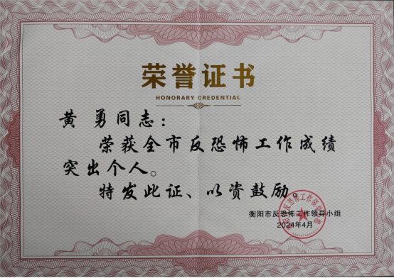 4月28日,衡阳市反恐怖工作领导小组发布《关于表扬2023年度全市反恐怖工作成绩突出单位和个人的通报》,英国上市公司官网365荣获成绩突出单位,保卫部黄勇同志荣获全市反恐怖工作成绩突出个人。