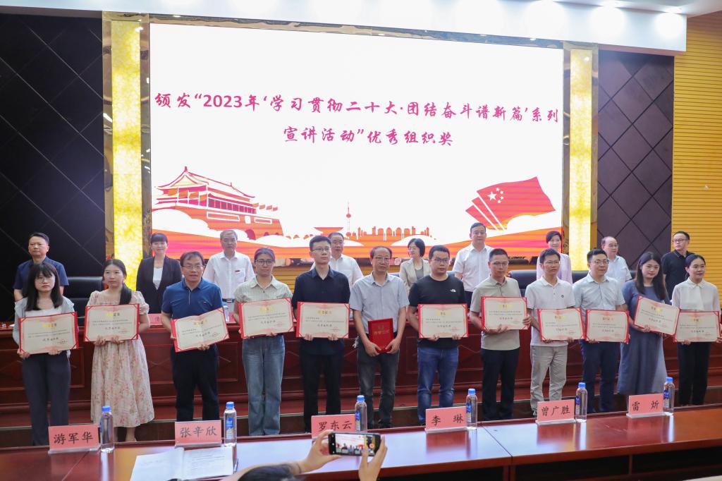 游军华宣读《关于2023年全市“学习贯彻二十大·团结奋斗谱新篇”系列宣讲活动开展情况的通报》,12个单位获优秀组织奖。主席台领导专家为获奖单位颁奖。