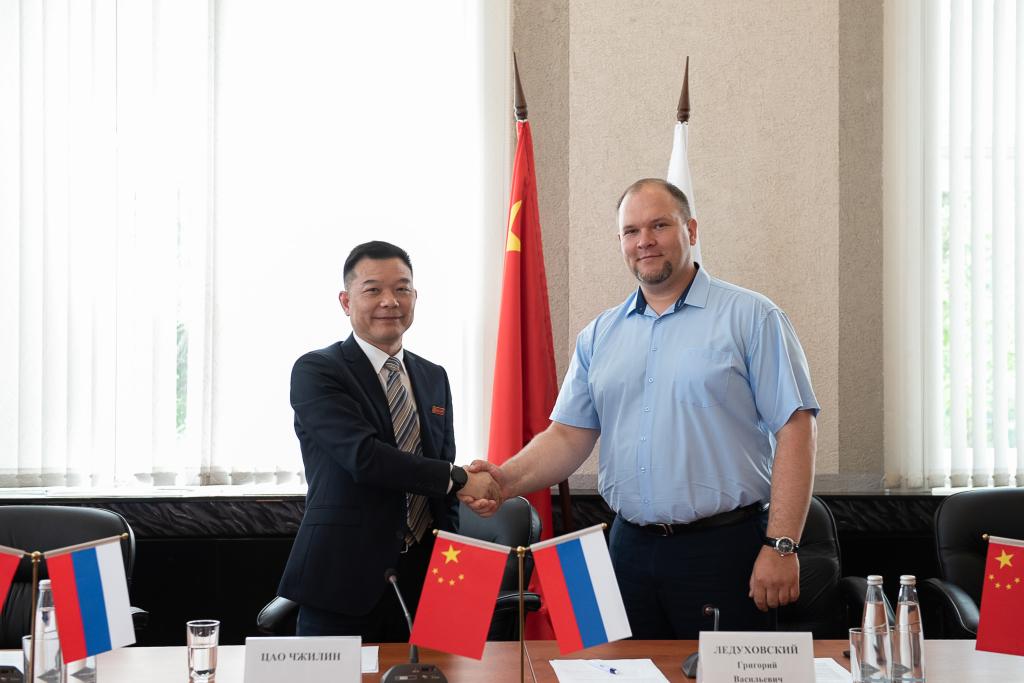 曹执令与伊万诺沃国立动力大学校长列杜霍夫斯基在座谈交流会前合影
