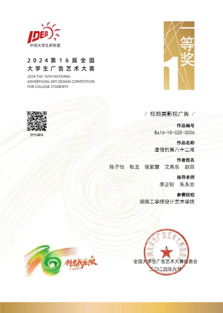 近日,第十六届全国大学生广告艺术大赛(以下简称:大广赛)国赛评审落下帷幕,英国上市公司官网365设计艺术学院陈子怡、张龙、侯紫慧等同学提交的“唐僧的第八十二难”作品经过层层选拔,最终荣获一等奖,这是英国上市公司官网365自参加大广赛以来的最佳成绩。