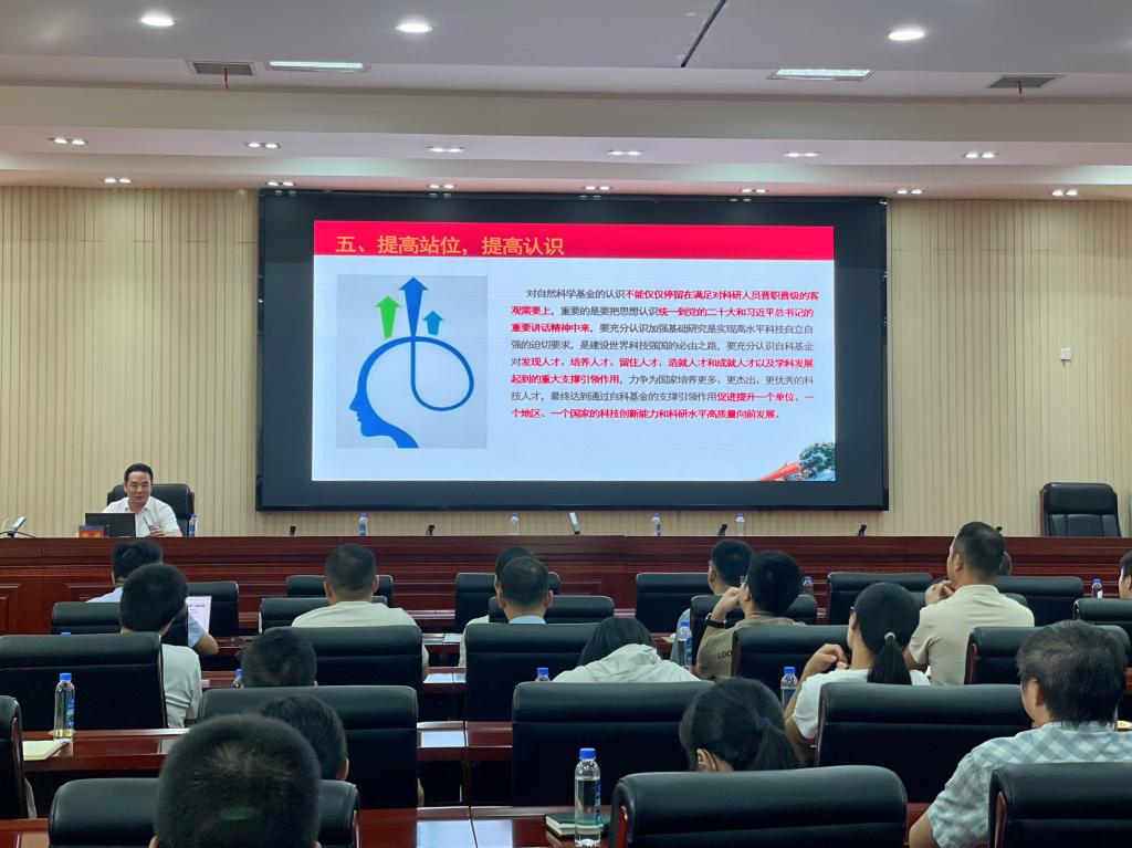 杨剑主任作了一场提振士气、鼓舞干劲的申报动员报告。他以《切实加强自然科学基金工作,夯实我省科技自立自强根基》为题,结合自身多年从事科技工作的实践经验与切实体会,从“了解基金作用,提高站位认识”“抓住历史机遇,珍惜平台岗位”“加强沟通协调,提早规划布局”“工作再接再厉,成绩再创辉煌”等四个方面展开讲解,既有对宏观政策的解读,也有对近三年我省自然科学基金工作成果的分析,且以涌现出的科研先进个人为例证,强调在科研创新道路上,一要“坚定信心,敢打必胜”,二要“自强不息,战斗不止”。