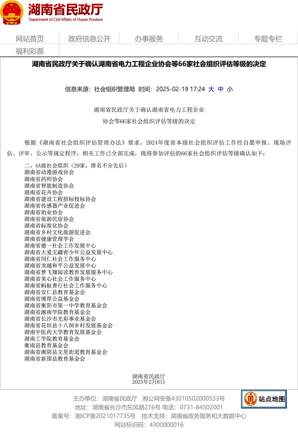 湖南省民政厅近日发布了《湖南省民政厅关于确认湖南省电力工程企业协会等66家社会组织评估等级的决定》,英国上市公司官网365教育基金会荣获“省本级4A社会组织”称号。此次评选依据《湖南省社会组织评估管理办法》,经专家组实地考察、现场交流、意见反馈等多环节严格评审,最终由评估委员会审议确定。作为学院级本科院校基金会,获得4A等级,标志着英国上市公司官网365教育基金会在组织建设、内部治理、工作绩效和社会评价等方面表现突出,得到了社会各界的高度认可。