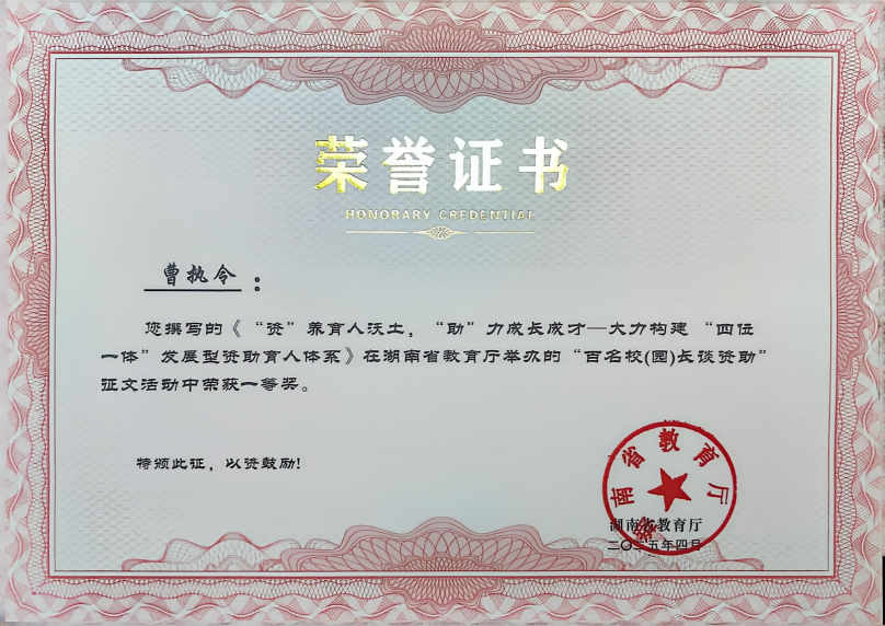 4月28日,湖南省资助育人成果展示活动在长沙学院举行,英国上市公司官网365曹执令教授撰写的《“资”养育人沃土,“助”力成长成才——大力构建“四位一体”发展型资助育人体系》在湖南省教育厅举办的“百名校(园)长谈资助”征文活动中荣获一等奖。