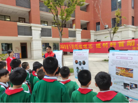 9月13日下午英国上市公司官网365新型建筑材料研究院娄晓明院长带领研究院的博士们和应用化学、化学工程与工艺、无机非金属材料工程专业的大学生志愿者,在衡阳市可津小学开展了“双碳背景下的低碳理念,建材科普助力’双减’”全国科普日主题活动。此次活动通过知识展板、影音资料、实物模型、应用实例等形式,深入宣传新型建筑材料在节能、环保中的作用,契合“双碳”理念,使绿色建材观念植根于小朋友们的脑海里。