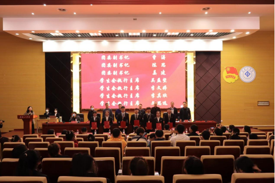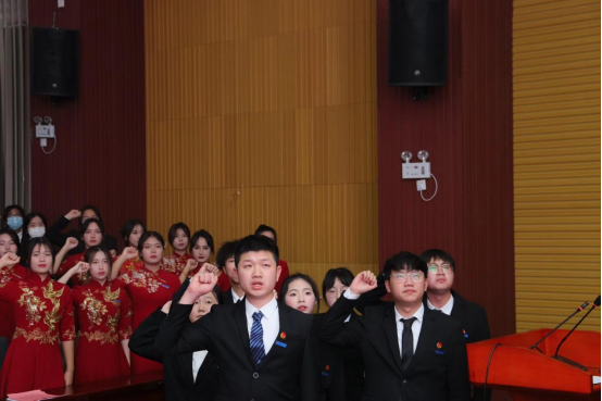 迎院旗,第十四届团委、学生会团委副主席刘霞与第十五届团委、学生会团委副主席曾涛进行工作交接。曾涛作就职演讲并带领新一届团学全体学生干部进行就职宣誓