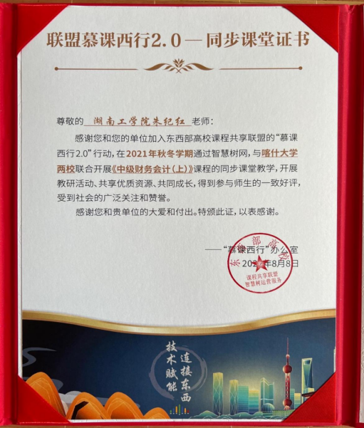 近日,我院朱纪红、温毅娴、杨英、龙桂华四位老师获得“联盟慕课西行2.0-同步课堂证书”。为积极响应“慕课西行2.0”计划,在智慧树网的协助下,我校与喀什大学、新疆科技学院通过东西部高校课程共享联盟平台建立联系,开展了“慕课西行”系列活动。我院教师积极开展“慕课西行”活动,表明教师们不仅以上好课为己任,并努力把好课送到西部去,为西部高等教育贡献力量,彰显了教师们的责任与担当,提升了学院美誉度和影响力。