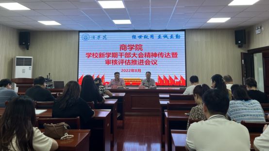 为全面落实学校新学期工作部署,稳步推进审核评估各项工作,8月29日,商学院在经302召开了学校新学期干部大会精神传达暨审核评估推进会议,全体院领导、全院教职员工参加,会议由党委书记曹文明主持。