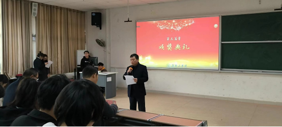 在颁奖仪式中,主持人宣布获奖成员,与会领导、教师为优秀同学颁奖并合影留恋。