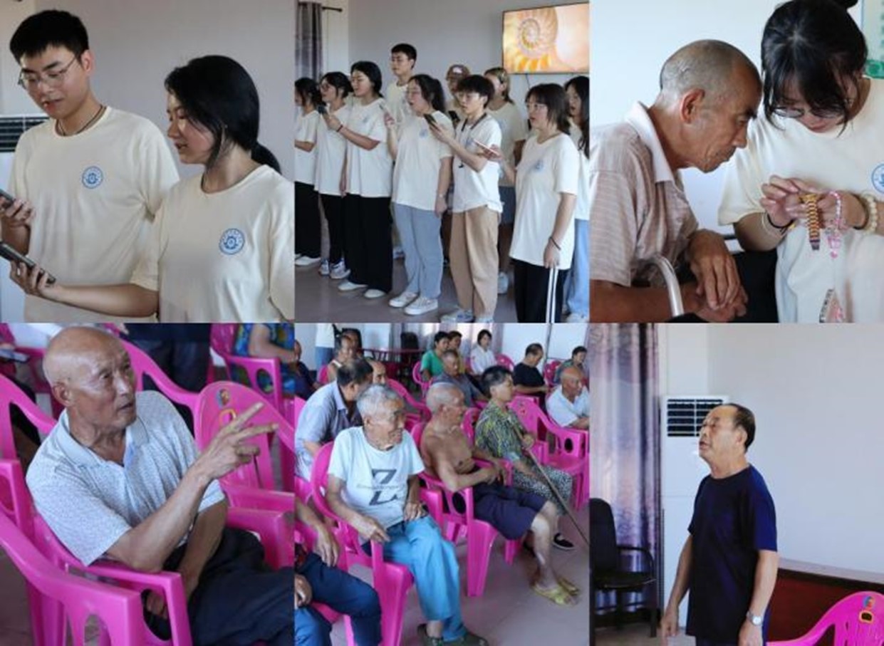 非遗项目花鼓戏作为湖南文化的重要组成部分,也是湖南人民传承和发扬优秀传统文化的重要方式,同学们通过排练打磨,将衡阳花鼓戏《打铁》、红歌《我和我的祖国》、《强军战歌》带入到敬老院中来,当地老人与同学们耐心讲解衡阳戏剧历史发展,大家在互动中充分感受到中国传统文化的独特魅力。听到耳熟能详的红歌和戏曲,爷爷奶奶们也按捺不住激动的心情,当上了红歌“明星”,带领青年唱红歌、忆党史、感党恩。”团队成员们为老人们整理内务、打扫房间,倾听心声,以真情奉献爱心,为敬老院带来暖意。