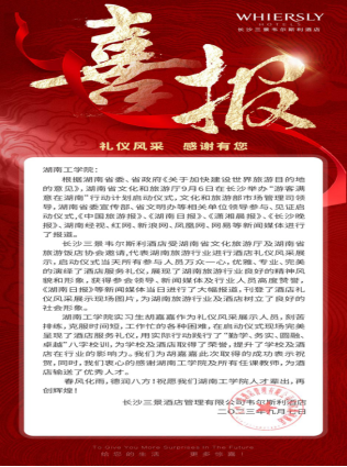 近日,我院收到来自实践基地(长沙三景韦尔斯利酒店)的喜报。我院酒店管理专业学生代表湖南旅游行业进行了酒店礼仪风采展示,获得高度赞誉,为湖南旅游业及长沙三景韦尔斯利酒店树立了卓越的典范。