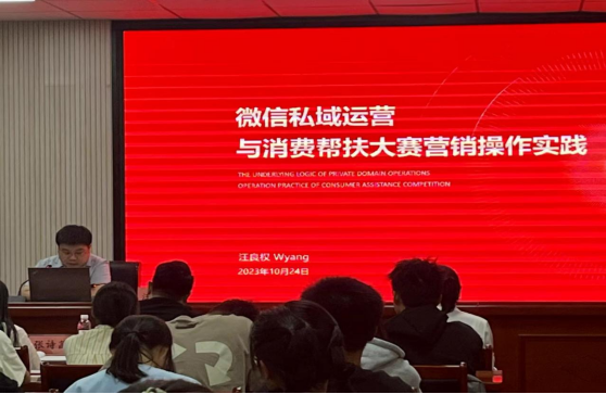 汪良权以《微信私域运营与消费帮扶大赛营销操作实践》为题,从大赛介绍、参与方式、方案指导和营销实践四个方面为基点展开培训,他详细介绍了微信营销的实操流程、如何开展社群营销与推广、如何获得佣金和相关奖金及荣誉,具有很强的指导性,极大的激发了同学们的参赛热情。