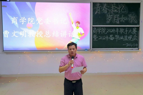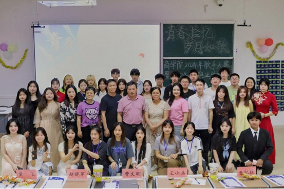 5月28日晚,商学院于经管楼601成功举办“青春拾忆,岁月如歌”歌手大赛暨2024届毕业生晚会。商学院党委书记曹文明、院长王小兵、副院长朱纪红、党委副书记赵晓军、学工办主任段思遥担任评委,全体辅导员及学生代表参加。