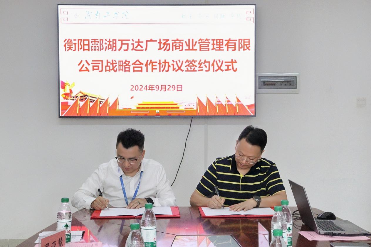 在与会人员的见证下,商学院党委书记王小兵与衡阳酃湖万达商业管理有限公司总经理尹小宝就共建实践教学基地等签署了《战略合作框架协议》,并现场举行授牌仪式。