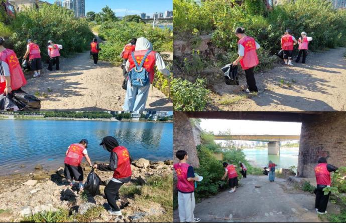 社区外围的河岸沿线,团队专门组织巡河清扫活动。志愿者们手持垃圾袋、长柄夹沿堤而行,按照团队分工分片排查,仔细清理岸边的塑料泡沫、渔网碎片等杂物。