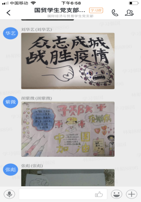 学生支部利用自身特点、创新活动形式,通过丰富多彩的线上活动深化了学生党员了对于党的防疫政策的理解,明确了青年党员面对当前形势应有的责任和担当。国际经济与贸易专业学生党支部的党员们通过制作多种形式的主题作品,表达了战胜疫情的期望和信心,宣传了防疫小知识,传递了正能量;工商管理专业学生党支部的党员们通过拍摄自己为“武汉加油,中国加油”的照片,一齐表达了中国必胜、共克时艰的信心和决心。