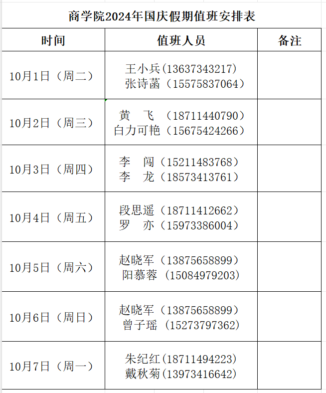 商学院2024年国庆假期值班安排表