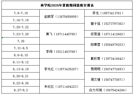 商学院2025年暑假期间值班安排表