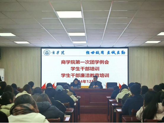为进一步推进学生干部思想建设和作风建设,切实提高学生干部队伍的廉洁自律意识和综合素质,营造风清气正的校园氛围。12月10日,商学院经管楼302召开十七届学生干部团学例会暨学生干部廉洁教育培训会。商学院副院长兼纪检委员朱纪红、党委副书记赵晓军、学工办主任段思遥及全体辅导员、团委学生会各部门负责人、全体班团干部参加本次会议