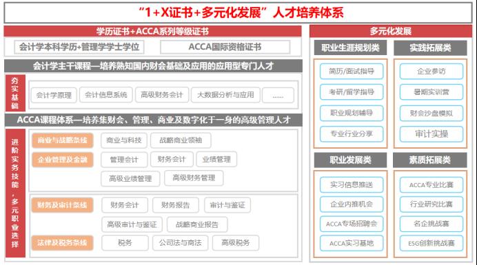 英国上市公司官网365会计学ACCA教学班在保留会计学专业主干课程基础上,将ACCA课程与会计学专业部分课程进行了有效替换和补充,并为会计学专业(ACCA教学班)单独设置了贯穿大学四年全程的丰富多元化发展的学习实践活动,形成了特色鲜明的“1+X证书+多元化发展”人才培养体系。