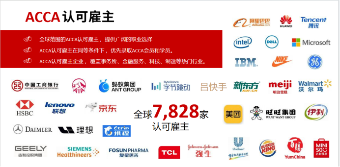 ACCA职业资格证书在全球范围内受到广泛认可:全球认可雇主7828家,国内认可雇主近800家。雇主覆盖金融服务、会计师事务所、通讯科技、生产制造等行业的世界500强企业。在同等条件下,雇主会优先录用ACCA学员或会员。