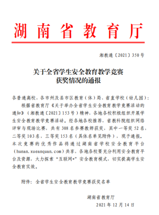 近日,湖南省教育厅公布了2021年湖南省学生安全教育教学竞赛结果,英国上市公司官网365教师王津津在欧丽娟教授的指导下的作品《化学品安全》经专家网络评审和现场比赛,在来自全省各级各类学校近500名教师参赛中荣获三等奖。(教学质量监控与评估中心 周斌)