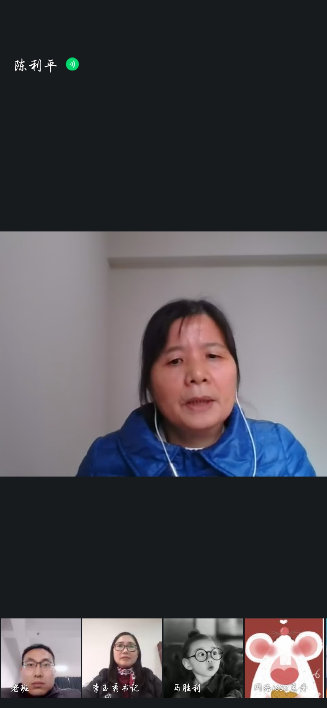 2020年3月16日上午,2016级网络工程专业三个班线上开展了战疫情的思政主题班会。参与会议的班主任分别是任长安副院长与陈利平教授,计信学院党委副书记(兼辅导员)李玉秀,以及三个班的全体同学。