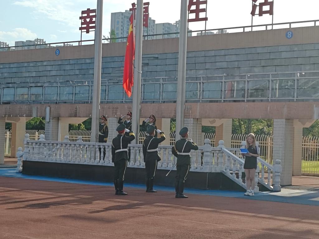 晨光微露,升旗仪式在庄严的氛围中拉开序幕。护旗手们迈着铿锵有力的步伐,将五星红旗护送至升旗台。当激昂的国歌响起,全体师生面向国旗行注目礼,庄严的国歌旋律与飘扬的五星红旗相映生辉,传递着家国情怀与青春担当。