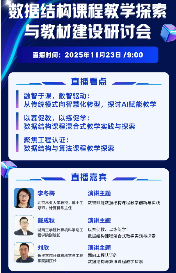 本次研讨会围绕数据结构课程教学创新与教材建设核心议题,搭建了高校间经验分享与学术交流平台。会上,多位高校专家学者进行了主题分享。北京林业大学李冬梅教授以“数智赋能数据结构课程教学创新与实践”为题,分享了数智化背景下课程改革思路与优质教材建设心得。长沙学院计算机科学与工程学院副院长刘欣聚焦 “面向工程认证的数据结构与算法课程教学探索”,阐述了工程认证导向下课程体系的优化路径;我院副教授戴成秋围绕 “以赛促教、以练促学”,分享了数据结构课程混合式教学的实践经验与创新路径。