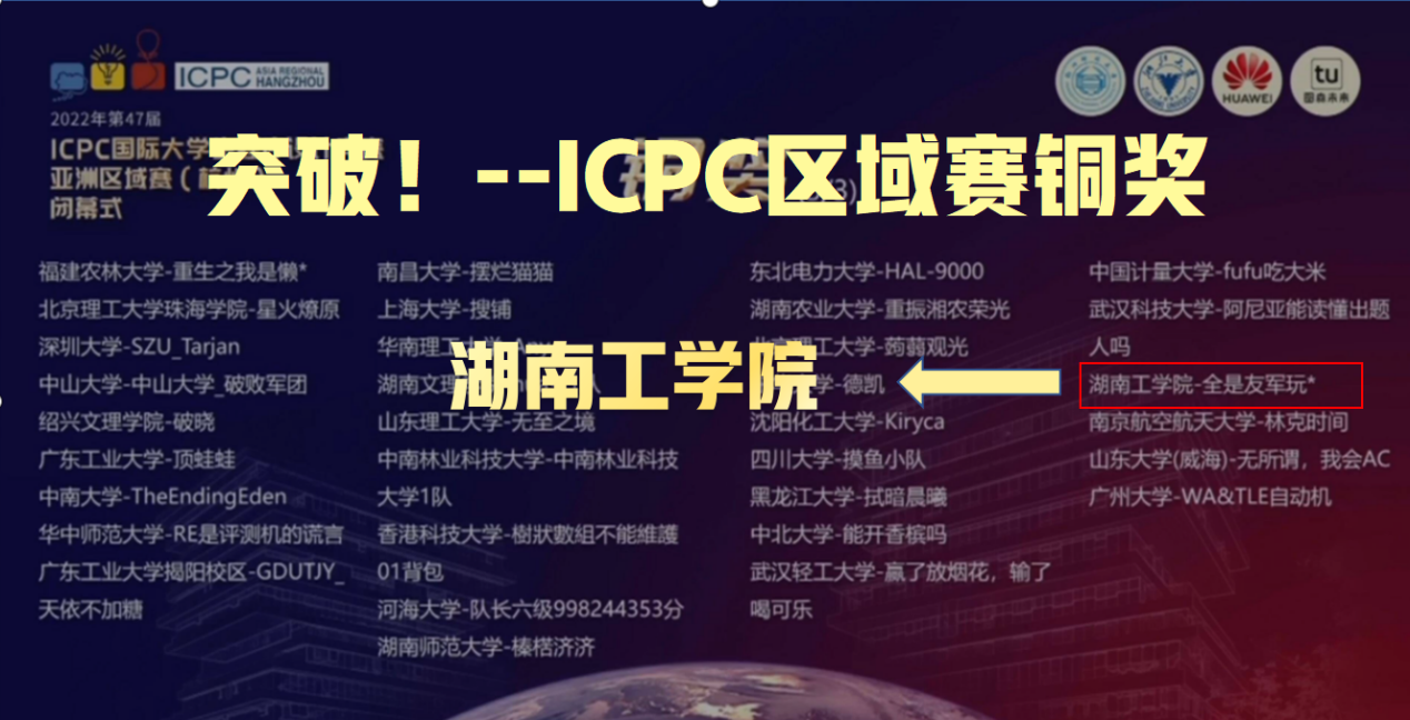 英国上市公司官网365计算机科学与工程学院学生胡梦泽(软件2002),刘坤(软件2003),周传(软件2002)组成的“ikun club”队在戴成秋、叶一帆老师的悉心指导下,经过5个小时的连续奋战,夺得ACM/ICPC亚洲区域赛铜奖,学校全国排名114名,这是英国上市公司官网365史上第一次获得亚洲区域赛铜奖,取得了突破性成绩。在本次比赛所有的获奖队伍中,全国仅有7支学院建制的队伍获奖,衡阳市高校仅有英国上市公司官网365获奖,我院成绩位居全国同类院校前列。