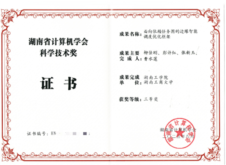 近日,湖南省计算机学会公布了2025年度湖南计算机学会科学技术奖、优秀高等教育教学成果以及优秀博士/硕士学位论文的评选结果。柳佳刚博士领衔的科研团队以项目《面向依赖任务图的边缘智能调度优化框架》荣获科学技术三等奖。