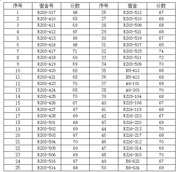 寝室是大学生日常生活和学习的重要场所,寝室环境与大学生生活息息相关,为做好我院寝室文明建设工作,确保大学生有一个良好的生活环境,生活部在本周进行了查寝,以下公布第周的查寝情况