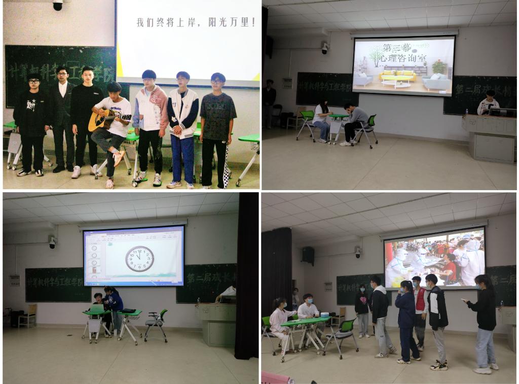 本次共有13支参赛队伍参加比赛,参赛作品内容丰富,选取的题材源于生活并高于生活,既有在亲情、友情感召下重拾生活信心,驱赶抑郁病魔的《抑愈》;也有战胜网瘾,摆脱对网络世界依赖的《时间都去哪了》;还有在面对困难家境,积极向上,勇于拼搏,不负韶华的奋斗在阳光下》。剧情真实感人演员们用生动逼真的表演完美诠释了当代大学生如何面对纷繁生活,战胜自我,拥抱健康心理成长历程。节目凸显出同学们的聪明才智,闪现出现实生活中的亮点,仿佛让人身临其境,赢得了在场观众的阵阵掌声。经过一番激烈的角逐,计科2103班花好月圆队节目抑愈》荣获一等奖。