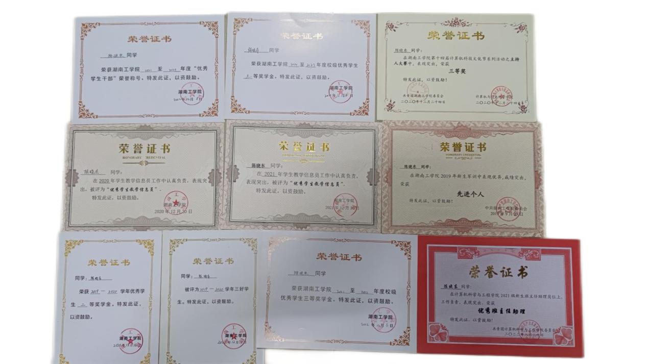 在校期间荣获国家奖学金1次、国家励志奖学金2次,获得软件设计师证书、蓝桥杯湖南赛区C/C++程序设计大赛B组三等奖、校级一等奖学金2次、校级二等奖学金1次、校级三好学生2次、优秀共青团干部1次、优秀学生干部1次。