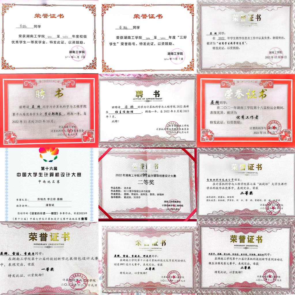 在校期间多次获得省、校级荣誉,荣获国家奖学金1次、国家励志奖学金1次、校级一等奖学金2次、校级“三好学生”称号2次、校级优秀共青团员1次,优秀共青团干部1次。曾参加湖南省大学生数字媒体创意设计大赛省级二等奖与第十六届中国大学生计算机设计大赛获中南赛区二等奖,在校期间积极参与志愿活动,被评为县级“优秀志愿者”。