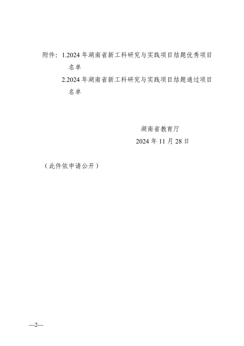 湖南省教育厅关于公布 2024 年湖南省 新工科研究与实践项目结题验收结果的通知