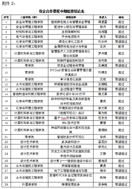 根据《关于开展对第一批校企合作课程结项验收和第二批校企合作课程中期检查工作的通知》(校教务〔2024〕236号),经专家评审,确定了结题验收和中期检查结果。现将结题验收和中期检查结果予以公布。
