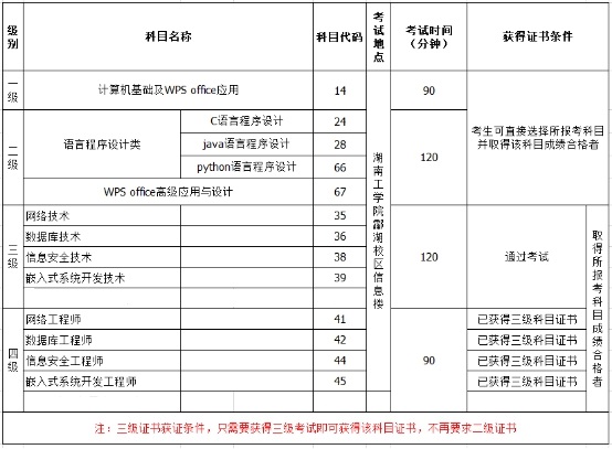 3.考生一次可同时报考同类别不同级别科目,通过者可获取两个科目证书,低级别未通过而高级别通过者,本次不能获得证书,高级别合格成绩保留半年有效,半年内报考低级别考试通过者,可以获得证书。