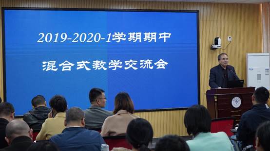 11月19日下午4:00,英国上市公司官网365在教学大楼311沉浸式直播教室召开了2019-2020-1学期期中混合式教学交流会,会议邀请了英国上市公司官网365李理教授及戴成秋老师作了交流报告,本学期立项的课程改革项目负责人、教务处相关人员及其他感兴趣老师60余人参加了会议。会议由教务处处长何建雄主持。