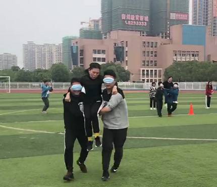 王香、袁野、陈吉林三人通力合作,取得“盲人抬花轿跑50米”比赛第4名的好成绩。