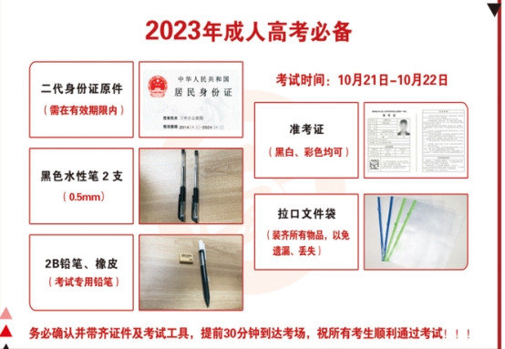各校外教学点及各位考生,2023年成人高考时间是:10月21-22两天,准考证打印时间是:10月16-22日。请各站点做好考前辅导,提醒学生按时打印准考证,按时参加考试。