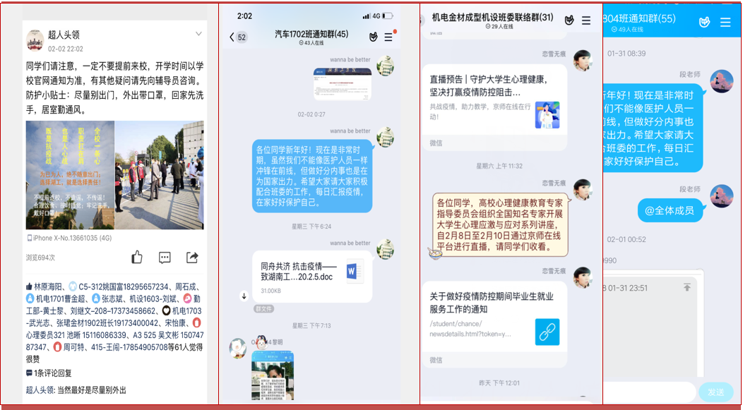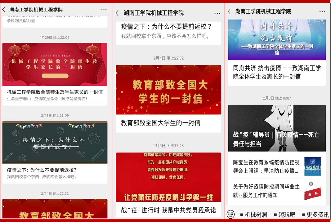 为阻绝新型冠状病毒传播,“宅”成为一个重要的举措。通过给学生、家长及教职工的一封信、疫情提示等形式开展传染病防控宣传教育,帮助师生提高防范意识、了解防治知识;停课不停教不停学,学院教师积极响应,主动作为,踊跃参加“在线授课”教程学习,为“到校延期,教学不延期”提早做好准备;对于湖北籍的20名学生,辅导员每天联系,了解学生身体状况并疏解因疫情引发的负面情绪,师生携手共克时艰;组织学生通过易班搭建防控疫情宣传教育优课群,转发上级各种通知,推送科普文,举办NCP知识答题活动。引导全体学生科学防疫,不信谣不传谣。