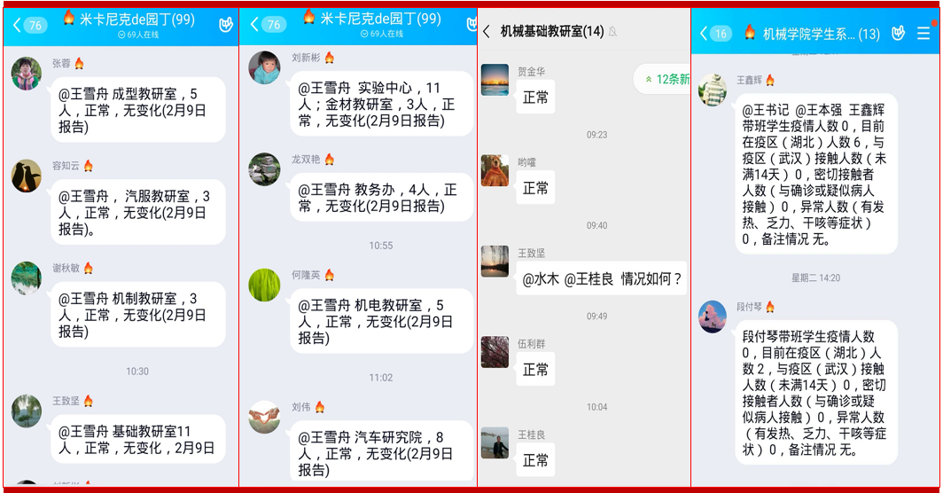 认真落实学校防疫工作要求,建立了教师及学生“日报制”两条主要工作渠道,全面摸清、准确掌握教师及学生健康状况和所在地区疫情等信息。鉴于寒假春节期间,绝大多数教职工、学生未在校,学院将信息排查作为工作的重中之重。自1月27日开始,全面排查教职工、学生出行情况,是否存在与疫区相关人员密切接触,全面排查是否存在发热、乏力、干咳等症状,做到每日排查汇总,12点前上报学校,切实做到早发现、早报告。学院各办公室、教研室、实验室的负责人及全体辅导员通过QQ群、电话、微信“我在校园”小程序等形式及时了解掌握教职工、学生相关情况,有专人负责,认真落实每日晨检制度和“日报告”、“零报告”制度,做到底子清、情况明。全体师生凝聚共识、通力协作,经摸排,全院65名教职工、2266名学生中,有3名教职工存在与疫区相关人员密切接触经史,经过14天自我隔离已无异常,湖北籍(非武汉)的20名学生身体未现异常。做到数据详实准确、无漏报,对疫情防控打下坚实的基础。